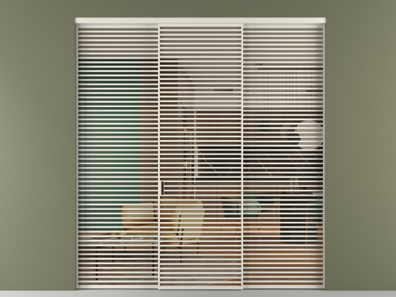 Во всех алюминиевых перегородках, независимо от типа установки, используется компланарный раздвижной механизм, благодаря которому декоративная крышка и полотно находятся в одной плоскости.