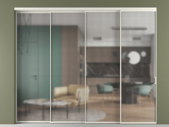 Дополнительно на раздвижную двустворчатую перегородку вдоль стены и четырёхстворчатую перегородку внутри проёма с двумя неподвижным полотнами можно установить механизм синхронного открывания — при открывании одной створки, вторая открывается автоматически.