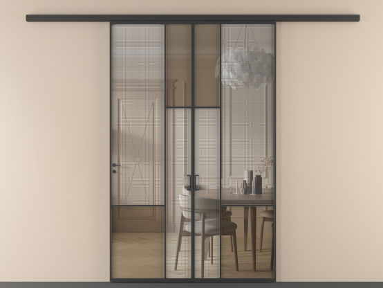 Во всех алюминиевых перегородках, независимо от типа установки, используется компланарный раздвижной механизм, благодаря которому декоративная крышка и полотно находятся в одной плоскости.