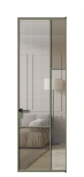 АЛПЛ041.12 Алюминий оливковый тёмный Декоративное стекло с сеткой "Mesh silver", триплекс, 6 мм + Прозрачное бронзовое стекло, триплекс