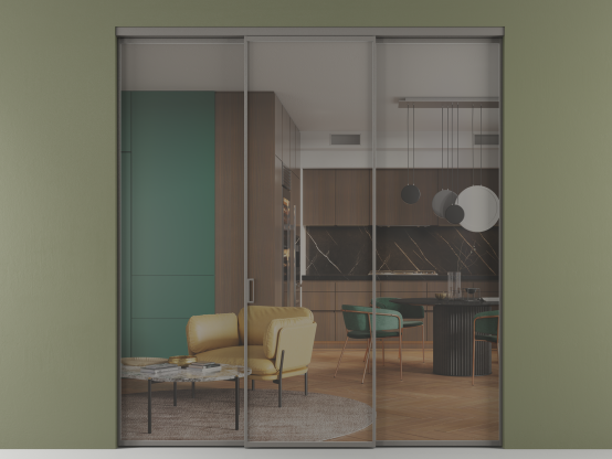 Во всех алюминиевых перегородках, независимо от типа установки, используется компланарный раздвижной механизм, благодаря которому декоративная крышка и полотно находятся в одной плоскости.