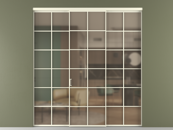 Во всех алюминиевых перегородках, независимо от типа установки, используется компланарный раздвижной механизм, благодаря которому декоративная крышка и полотно находятся в одной плоскости.