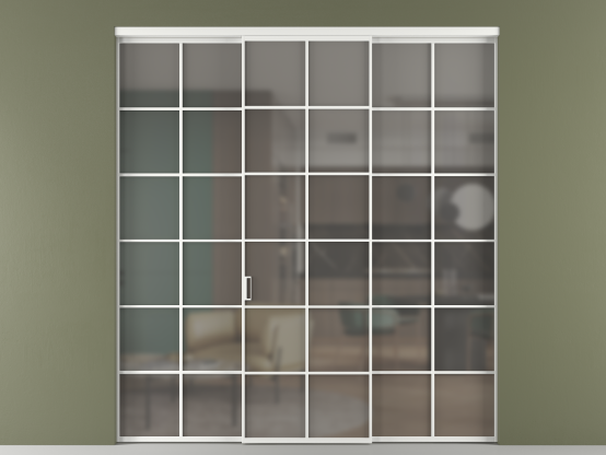 Дополнительно на раздвижную двустворчатую перегородку вдоль стены и четырёхстворчатую перегородку внутри проёма с двумя неподвижным полотнами можно установить механизм синхронного открывания — при открывании одной створки, вторая открывается автоматически.