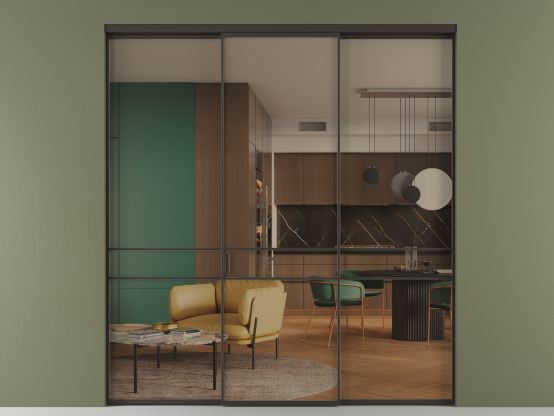 Алюминиевые перегородки имеют единый профиль с алюминиевыми дверьми и легко сочетаются в одном пространстве, не перегружая его. Также их можно комбинировать в интерьере с полотнами из нашего стандартного ассортимента. Помимо этого, система алюминиевых перегородок и дверей координируется со стеновыми панелями Волховец.