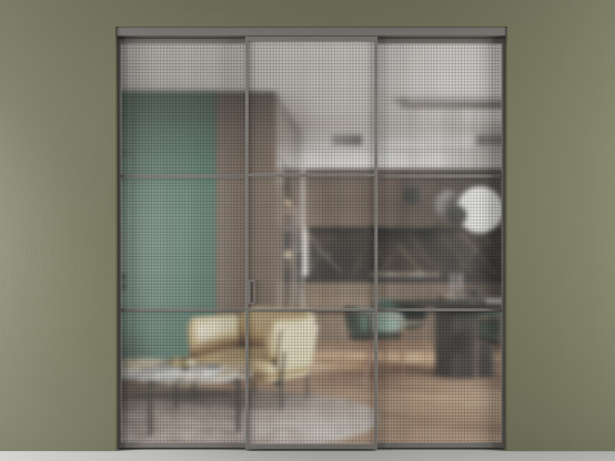Во всех алюминиевых перегородках, независимо от типа установки, используется компланарный раздвижной механизм, благодаря которому декоративная крышка и полотно находятся в одной плоскости.