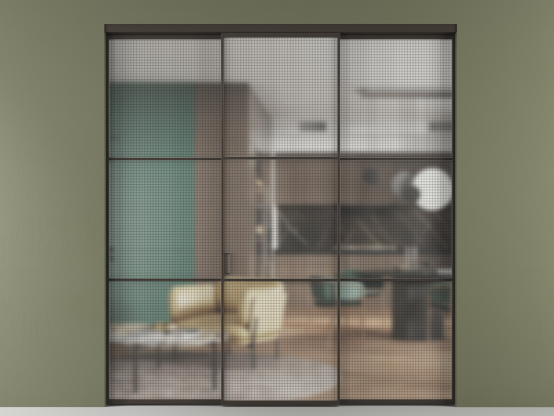 Во всех алюминиевых перегородках, независимо от типа установки, используется компланарный раздвижной механизм, благодаря которому декоративная крышка и полотно находятся в одной плоскости.