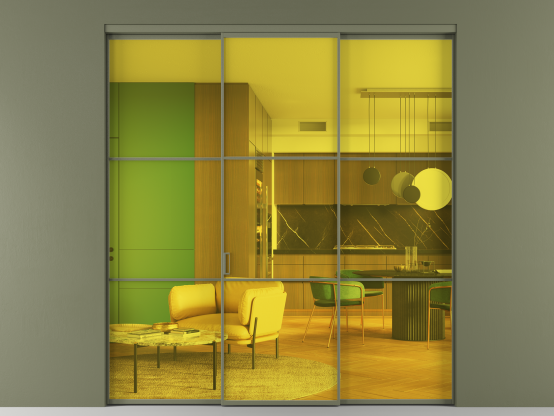 Мы предлагаем девять вариантов декоративного стекла: от кристально-прозрачного до матовых цветных, а также стёкла с эффектом Stopsol, когда лицевая сторона стекла зеркальная, но при включенном освещении за стеклом — становится прозрачной.