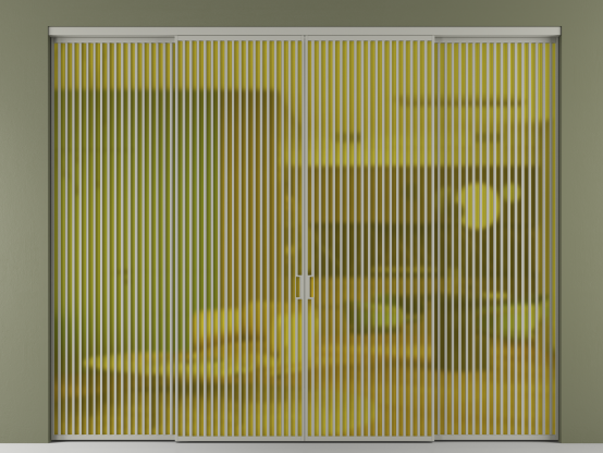 Дополнительно на раздвижную двустворчатую перегородку вдоль стены и четырёхстворчатую перегородку внутри проёма с двумя неподвижным полотнами можно установить механизм синхронного открывания — при открывании одной створки, вторая открывается автоматически.