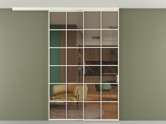 Во всех алюминиевых перегородках, независимо от типа установки, используется компланарный раздвижной механизм, благодаря которому декоративная крышка и полотно находятся в одной плоскости.
