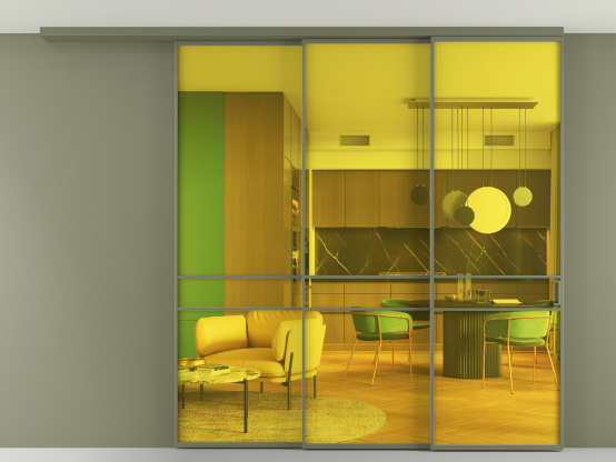 Мы предлагаем девять вариантов декоративного стекла: от кристально-прозрачного до матовых цветных, а также стёкла с эффектом Stopsol, когда лицевая сторона стекла зеркальная, но при включенном освещении за стеклом — становится прозрачной.