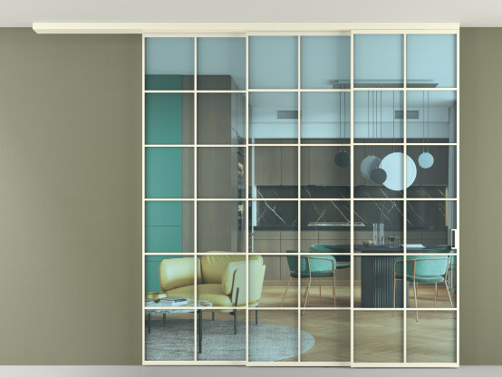 Алюминиевые перегородки имеют единый профиль с алюминиевыми дверьми и легко сочетаются в одном пространстве, не перегружая его. Также их можно комбинировать в интерьере с полотнами из нашего стандартного ассортимента. Помимо этого, система алюминиевых перегородок и дверей координируется со стеновыми панелями Волховец.