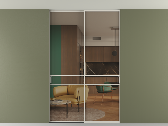 Алюминиевые перегородки имеют единый профиль с алюминиевыми дверьми и легко сочетаются в одном пространстве, не перегружая его. Также их можно комбинировать в интерьере с полотнами из нашего стандартного ассортимента. Помимо этого, система алюминиевых перегородок и дверей координируется со стеновыми панелями Волховец.