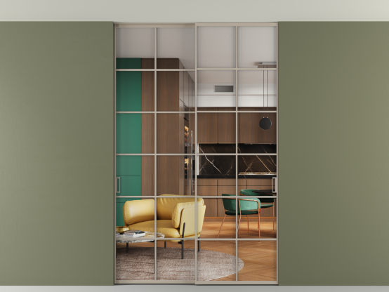 Алюминиевые перегородки имеют единый профиль с алюминиевыми дверьми и легко сочетаются в одном пространстве, не перегружая его. Также их можно комбинировать в интерьере с полотнами из нашего стандартного ассортимента. Помимо этого, система алюминиевых перегородок и дверей координируется со стеновыми панелями Волховец.
