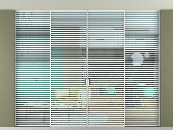 Дополнительно на раздвижную двустворчатую перегородку вдоль стены и четырёхстворчатую перегородку внутри проёма с двумя неподвижным полотнами можно установить механизм синхронного открывания — при открывании одной створки, вторая открывается автоматически.