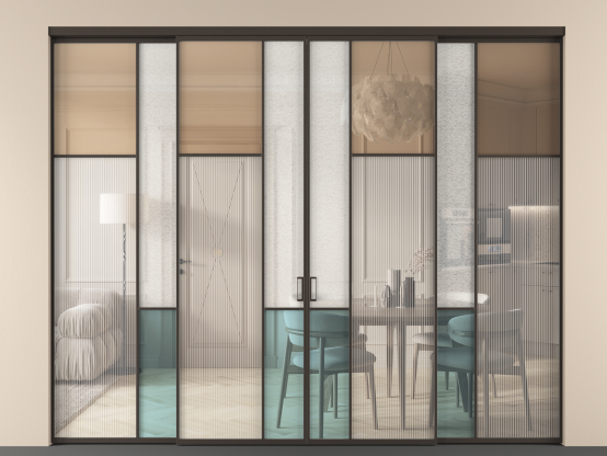 Дополнительно на раздвижную двустворчатую перегородку вдоль стены и четырехстворчатую перегородку внутри проема с двумя неподвижным полотнами можно установить механизм синхронного открывания — при открывании одной створки, вторая открывается автоматически.