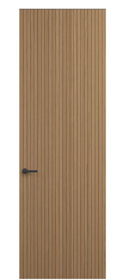 Селект — коллекция минималистичных дверей с фрезеровкой по натуральному шпону. Рельеф на поверхности полотна создаёт игру света и тени, добавляя пространству динамичности и визуального объёма. Двери Селект в сочетании со стеновыми панелями и мебельными фасадами, повторяющими лаконичный дизайн, создают единое стилевое решение.