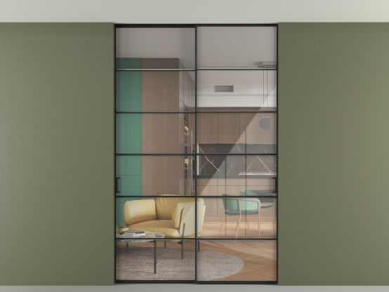 Алюминиевые перегородки имеют единый профиль с алюминиевыми дверьми и легко сочетаются в одном пространстве, не перегружая его. Также их можно комбинировать в интерьере с полотнами из нашего стандартного ассортимента. Помимо этого, система алюминиевых перегородок и дверей координируется со стеновыми панелями Волховец.
