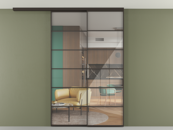 Во всех алюминиевых перегородках, независимо от типа установки, используется компланарный раздвижной механизм, благодаря которому декоративная крышка и полотно находятся в одной плоскости.