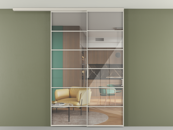Во всех алюминиевых перегородках, независимо от типа установки, используется компланарный раздвижной механизм, благодаря которому декоративная крышка и полотно находятся в одной плоскости.