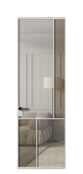 АЛПЛ041.21 Алюминий тёплый серый Декоративное стекло с сеткой "Mesh silver", триплекс, 6 мм + Прозрачное бронзовое стекло, триплекс, 6 мм