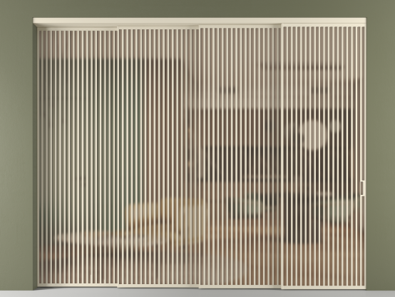 Дополнительно на раздвижную двустворчатую перегородку вдоль стены и четырёхстворчатую перегородку внутри проёма с двумя неподвижным полотнами можно установить механизм синхронного открывания — при открывании одной створки, вторая открывается автоматически.