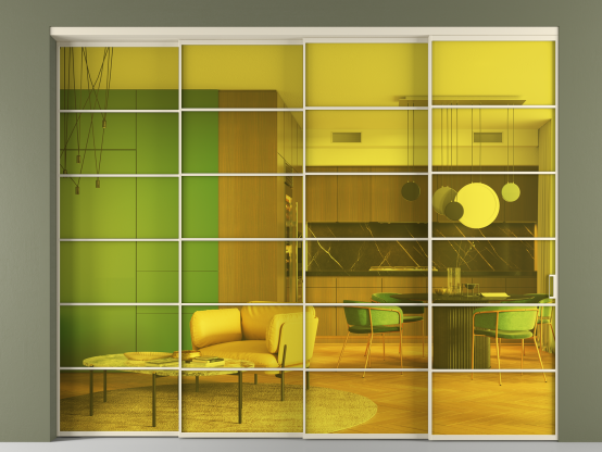 Мы предлагаем девять вариантов декоративного стекла: от кристально-прозрачного до матовых цветных, а также стёкла с эффектом Stopsol, когда лицевая сторона стекла зеркальная, но при включенном освещении за стеклом — становится прозрачной.