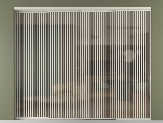Во всех алюминиевых перегородках, независимо от типа установки, используется компланарный раздвижной механизм, благодаря которому декоративная крышка и полотно находятся в одной плоскости.