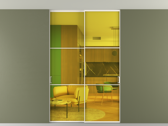 Мы предлагаем девять вариантов декоративного стекла: от кристально-прозрачного до матовых цветных, а также стёкла с эффектом Stopsol, когда лицевая сторона стекла зеркальная, но при включенном освещении за стеклом — становится прозрачной.