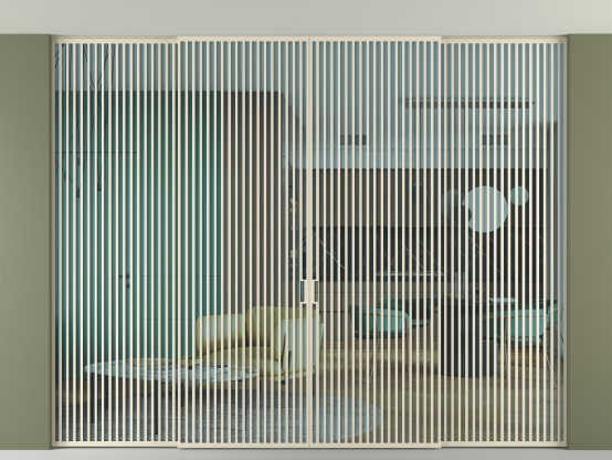 Дополнительно на раздвижную двустворчатую перегородку вдоль стены и четырёхстворчатую перегородку внутри проёма с двумя неподвижным полотнами можно установить механизм синхронного открывания — при открывании одной створки, вторая открывается автоматически.