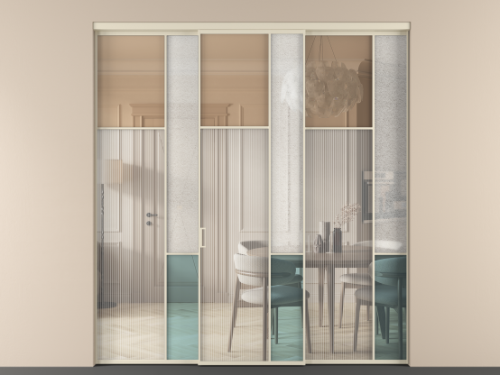 Дополнительно на раздвижную двустворчатую перегородку вдоль стены и четырехстворчатую перегородку внутри проема с двумя неподвижным полотнами можно установить механизм синхронного открывания — при открывании одной створки, вторая открывается автоматически.