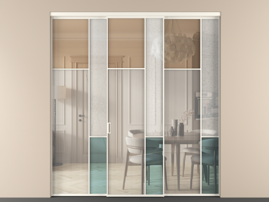 Дополнительно на раздвижную двустворчатую перегородку вдоль стены и четырехстворчатую перегородку внутри проема с двумя неподвижным полотнами можно установить механизм синхронного открывания — при открывании одной створки, вторая открывается автоматически.