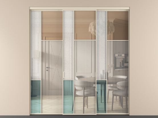 Дополнительно на раздвижную двустворчатую перегородку вдоль стены и четырехстворчатую перегородку внутри проема с двумя неподвижным полотнами можно установить механизм синхронного открывания — при открывании одной створки, вторая открывается автоматически.
