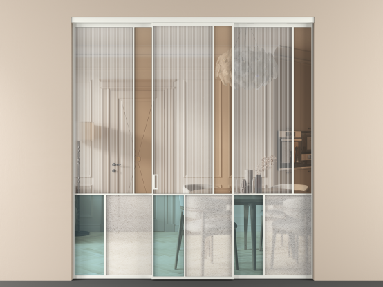 Во всех алюминиевых перегородках, независимо от типа установки, используется компланарный раздвижной механизм, благодаря которому декоративная крышка и полотно находятся в одной плоскости.