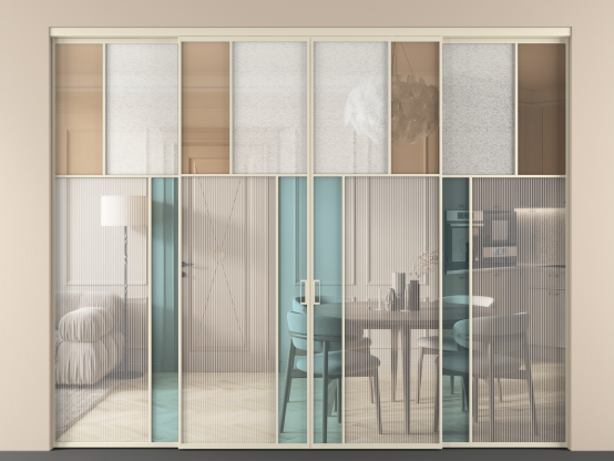 Дополнительно на раздвижную двустворчатую перегородку вдоль стены и четырехстворчатую перегородку внутри проема с двумя неподвижным полотнами можно установить механизм синхронного открывания — при открывании одной створки, вторая открывается автоматически.