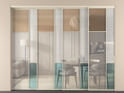 Дополнительно на раздвижную двустворчатую перегородку вдоль стены и четырехстворчатую перегородку внутри проема с двумя неподвижным полотнами можно установить механизм синхронного открывания — при открывании одной створки, вторая открывается автоматически.