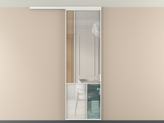 Во всех алюминиевых перегородках, независимо от типа установки, используется компланарный раздвижной механизм, благодаря которому декоративная крышка и полотно находятся в одной плоскости.
