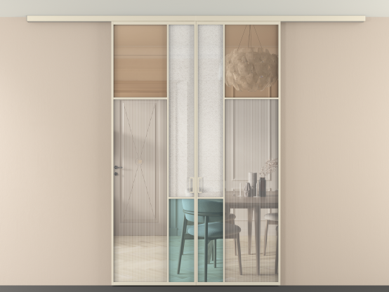Дополнительно на раздвижную двустворчатую перегородку вдоль стены и четырехстворчатую перегородку внутри проема с двумя неподвижным полотнами можно установить механизм синхронного открывания — при открывании одной створки, вторая открывается автоматически.