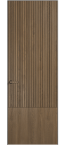 Это полотна с рельефной фрезеровкой. Этот прием делает интерьер объемным, тактильным, вносит интересную текстуру и создает современный образ. Волнистый рельеф может быть выполнен по ламелям из массива дуба в древесных матовых отделках, либо исполнен по натуральному и экологически безопасному материалу — ХДФ, покрытому гладкой эмалью актуальных оттенков.